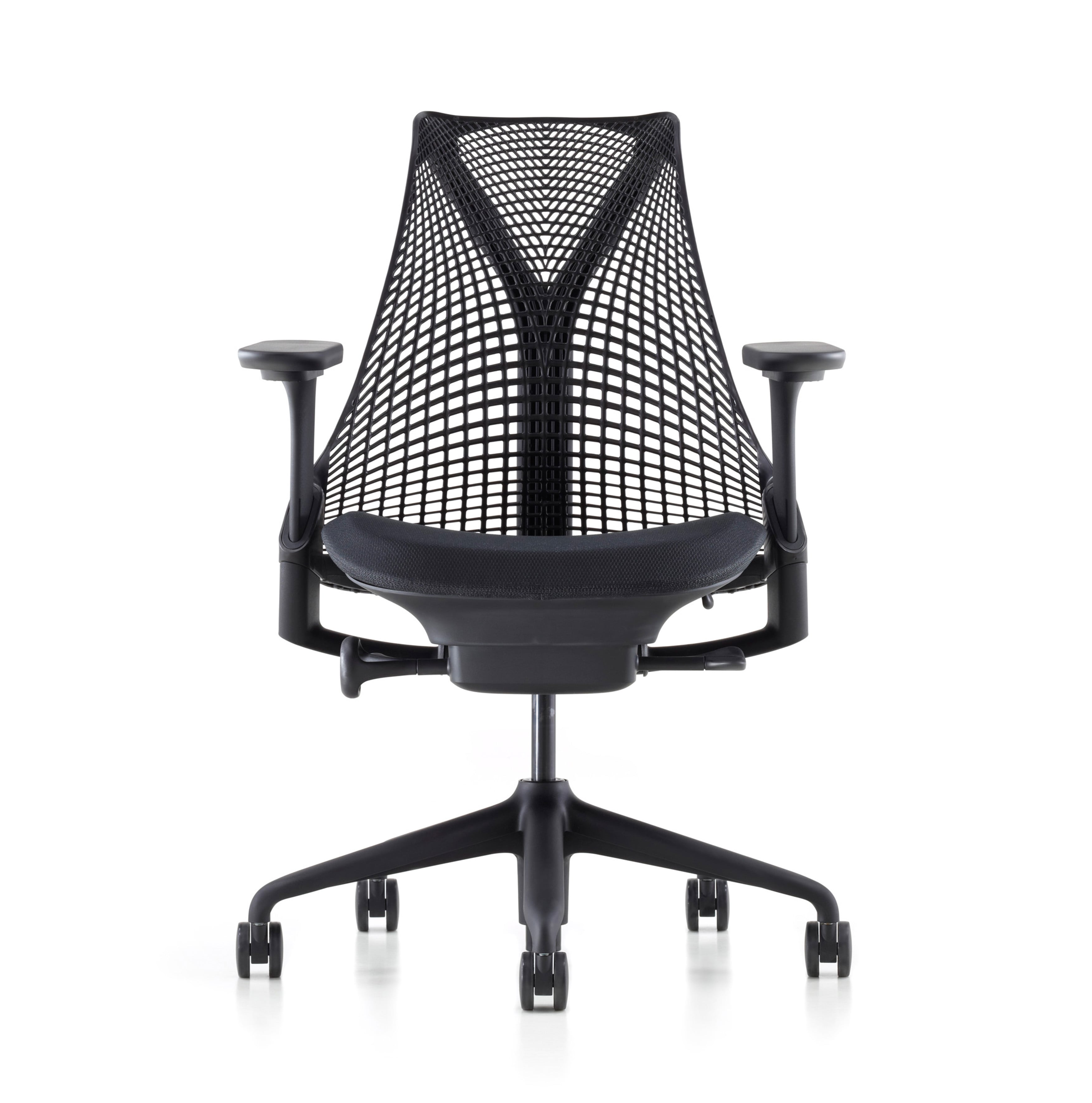 べアールは吊り橋の工学原理をチェアに応用し、背面のY字タワーが網目状のサスペンションバックを支えるという、フレームを最小限とする構造を生み出しました。エラストマー素材製のサスペンションバックは張力を最大限に発揮するように、体を支える箇所によって張力を調整して設計されています。